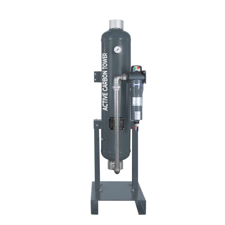 Compressed air from the compressor first passes through a high-performance pre-filter that captures larger oil droplets and particles. It then flows uniformly through a specially designed diffuser into the activated carbon bed. As the air moves through the tower, oil vapor and hydrocarbons are adsorbed by the carbon media. The result is clean, odorless compressed air, discharged through a silenced outlet.