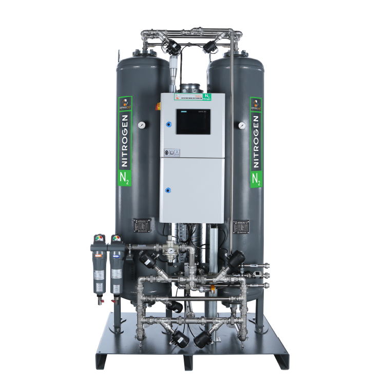 Nitroxtec Twin Tower PSA Nitrogen Generators provide a robust and cost-effective solution for on-site nitrogen production, removing the need for nitrogen cylinders or liquid nitrogen supplies. Utilizing advanced Pressure Swing Adsorption (PSA) technology with carbon molecular sieves (CMS), these generators deliver ultra-high purity nitrogen—up to 99.9999%—ensuring a stable and reliable supply tailored to your industry’s most demanding requirements.